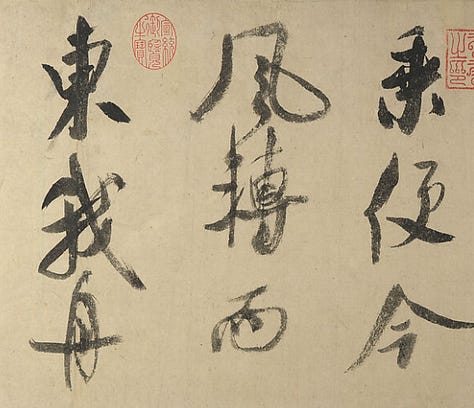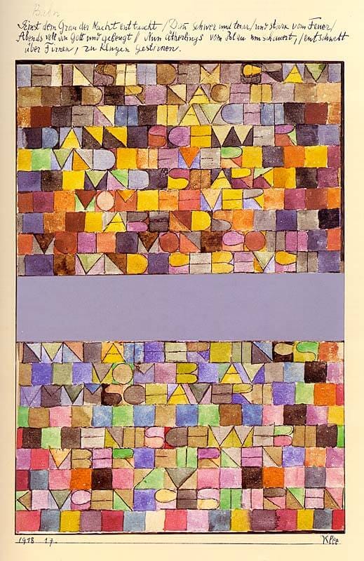 In 1916, German artist Paul Klee began painting watercolors built around lines of German translations of Chinese verse, which he called color-writing. These works touched upon a German Romantic theory of Chinese character writing as a form of hieroglyphics, “a primeval union of picture and writing,” resistant to any definitive reading. This theory is now debunked (Chinese writing is logographic), and in any case, Klee soon moved on.