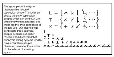 The visual word form area [in the human brain] seems to arise from this preexisting neuronal alphabet: a subset of the shape-recognition system specializes in the shapes of letters…in all of the world’s cultures, scribes in generation after generation progressively selected their letters and written characters to closely match the set of shapes that were already present in the brains of all primates and, as a result, were easy to learn. This hypothesis is corroborated by a large-scale analysis of the world’s writing systems.