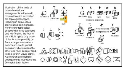 “Neurons in the ventral visual pathway often respond to simple shapes, such as those formed by the intersections of contours of objects. Even in the macaque monkey, the inferotemporal visual cortex already contains neurons sensitive to letter-like combinations of lines such as T, L, X, and *.